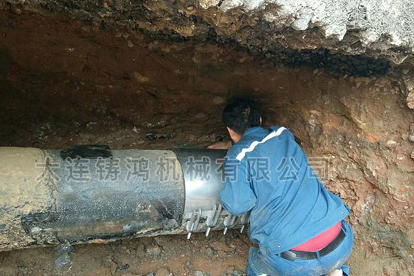 四川攀枝花一處地下管線因施工被破壞,管道材質(zhì)為鋼管,管徑426mm,壓力2公斤左右,管子漏點(diǎn)處有十五公分直徑漏洞,由于是煤氣管,搶修迫在眉睫,此漏點(diǎn)造成周邊區(qū)域停氣,需要快速補(bǔ)漏,使用“鑄鴻”雙卡板式修補(bǔ)器進(jìn)行快速修復(fù),從開(kāi)挖到回填,整個(gè)過(guò)程不到三個(gè)小時(shí),恢復(fù)送氣!